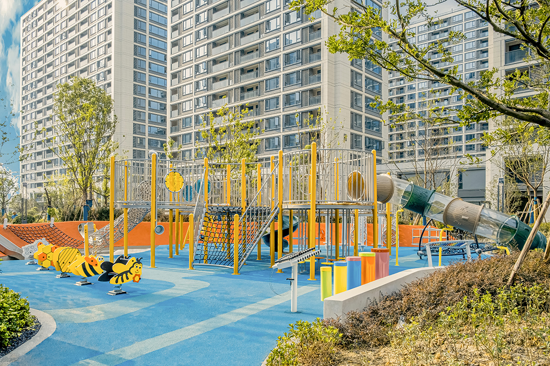 项目位于浙江省杭州市富阳区秦望小区。飞鲸游乐设计团队以为儿童创造出良好的游乐玩耍环境作为出发点,从材料、色彩、形态等去做设计,在儿童玩耍的同时以培养他们的美好情操,陶冶心灵,融入自然,寓教于乐。色彩上我们选用了鲜艳明快的颜色,用以区分不同的空间领域,场地通过不规则的铺装变化,在整个景观设计相协调的基础上突出特色,调动儿童的积极性,增加了游玩的乐趣。整体设计以未来儿童的真实需求为设计出发点,打造出了一个充满童趣的儿童游乐空间,为周边居民提供了一个遛娃好去处。