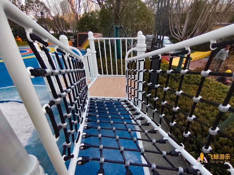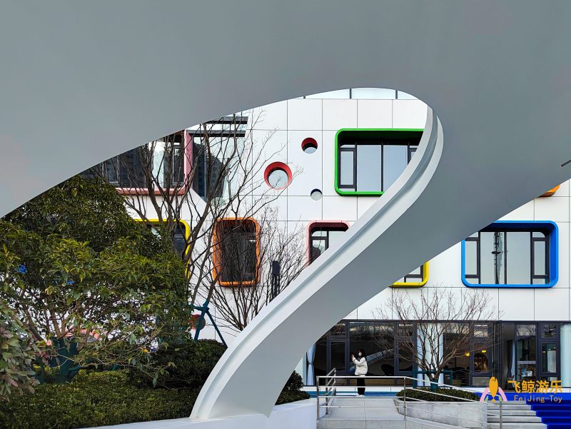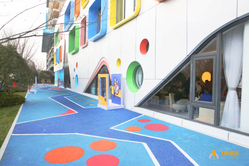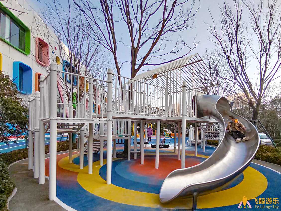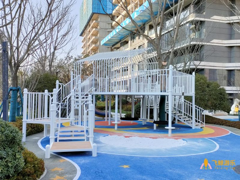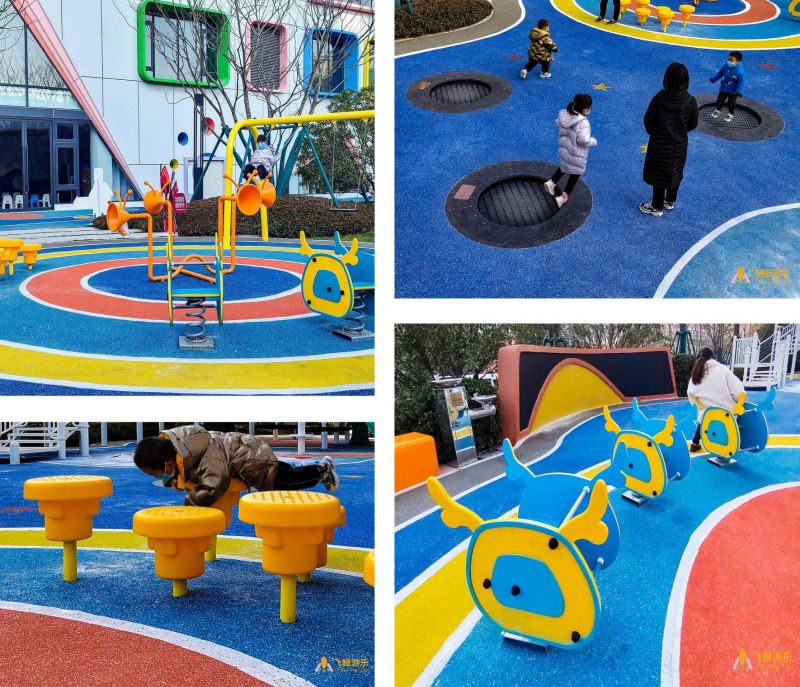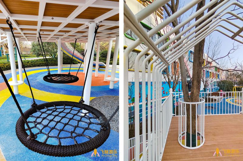乐园设计围绕树屋展开,构筑悬置空中的小屋景观平台,平台两侧步梯、四川爬网形成上下联通的步道,多向的空间流线增强了自由度与开放性,同时让空间更具新奇有趣的视觉感。树屋下是多种多样的游玩设备,构建出亲子互动的沉浸式体验场所。