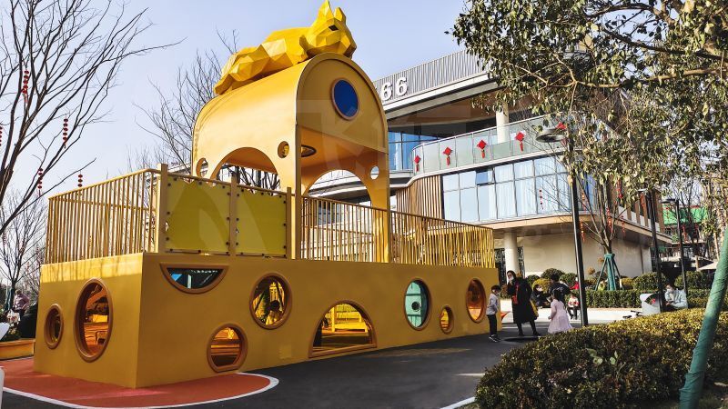 乐园地面黄橙色调的彩绘景观吸引行人不断来此探索,在乐园里玩耍或驻足休憩,包含各种地面游戏和游乐设备,让儿童和成人都可以享受轻松愉快的趣味时光。