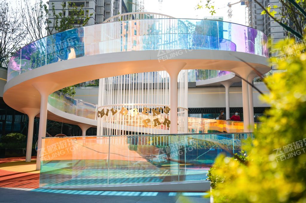 廊架延伸连接地面至下沉广场,通体围栏采用炫彩玻璃材质,不同角度折射出不同色彩,形与色,光与影之间创造出一种多维空间的沉浸式体验。红橙搭配地垫,为孩子们奔跑蹦跳玩耍提供缓冲保障。内部坐凳休憩感受阳光。廊架下是休憩好去处,孩子们嬉戏奔跑,在柔软泡泡椅里沐浴阳光,感受惬意时光。
